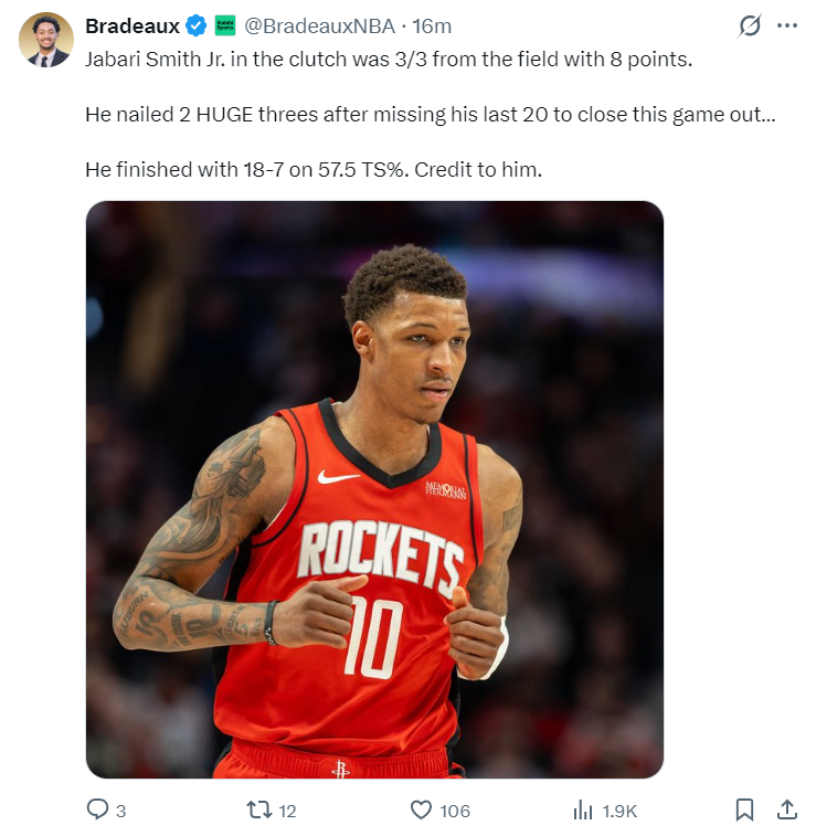火箭记者Bradeaux写道:这场比赛史密斯在决胜时刻3中3拿到8分,他在连续投丢了20个三分球后完成了三分2中2,他的三分球终结了比赛,他最终拿到18分,真实命中率57.5%值得称道。