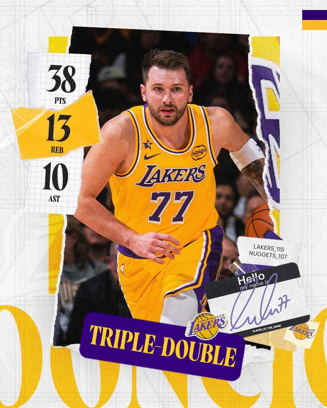 詹姆斯准3双,湖人16分逆转掘金!东契奇38+13+10创历史第2神迹