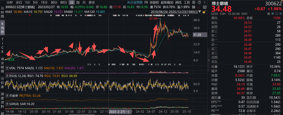 金石杂谈查询发现,博士眼镜其实有明显的股价波动情况,经常是涨一段时间,跌一段时间。以21年12月为例,曾7个交易日涨超50%,然后在此后的2-3个月股价持续阴跌,最终腰斩之上。