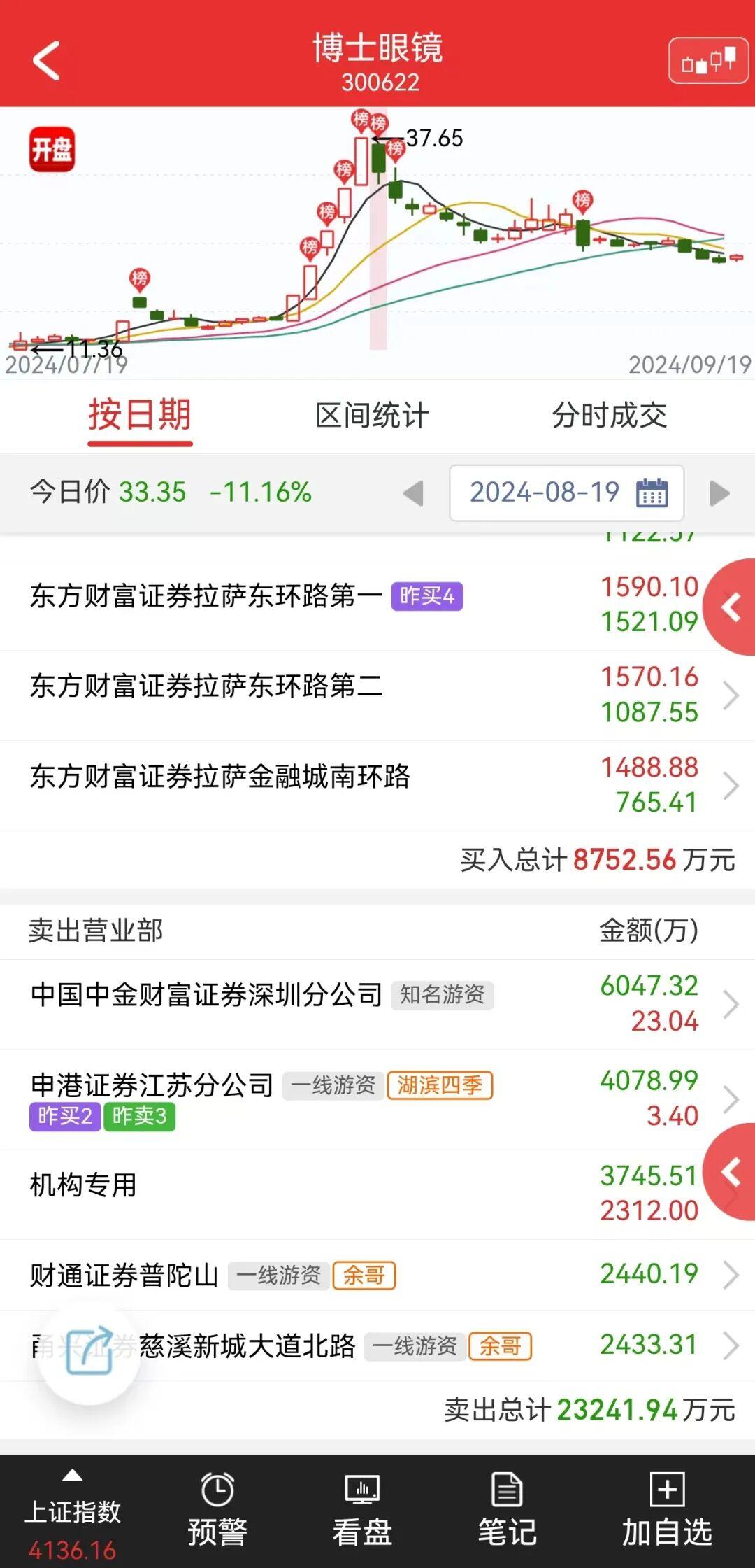 二是,余哥也曾出现过“博士眼镜”的龙虎榜。8月15日开市,余哥开始频繁现身博士眼镜,8月19日余哥卖出8000多万。