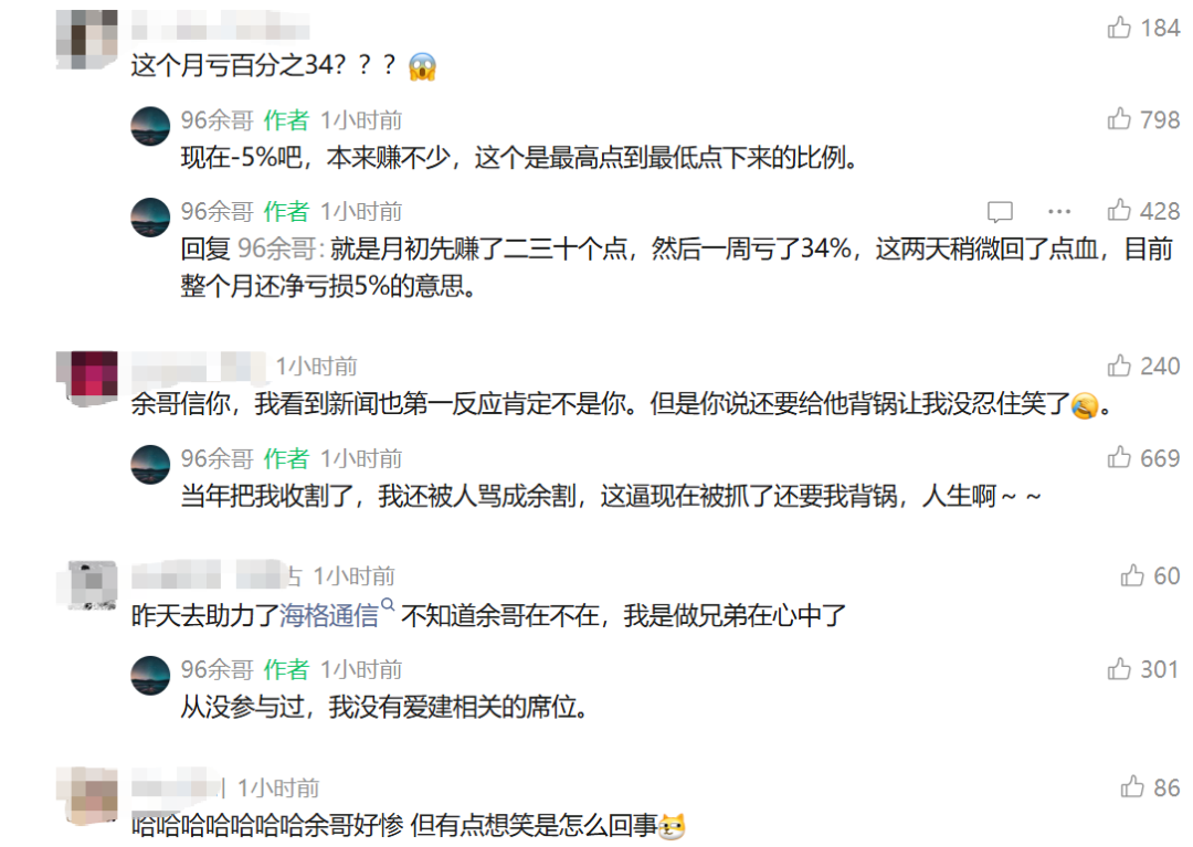 4)来自余哥自身的辟谣:一是,同姓被牵扯:有人坐庄被罚只是跟我同姓就牵扯到我,真的无语;二是,余哥曾被余韩收割:当时炒ai眼镜的时候正巧在5板接力过,博士眼镜被砸的稀里哗啦的,高位接力被这逼(余韩)收割了,最后还要给他背锅,没天理了;